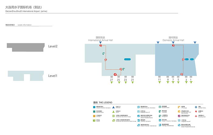 二楼出发大厅2号-4号之间设施包括电梯一部及商业店铺。机场打包处位于4号门及10号门对面。