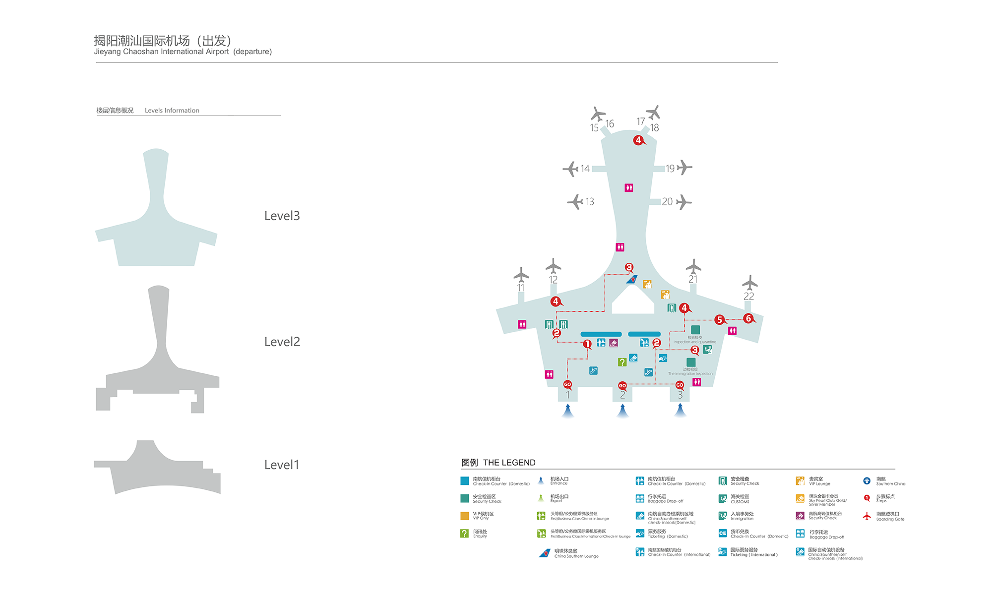 三层:国内、国际出发层。国内航班旅客在该层办理安检手续。国际航班旅客在该层办理海关、检验检疫、边防、安检手续。设有国内两舱休息室、机场餐饮休息区等。