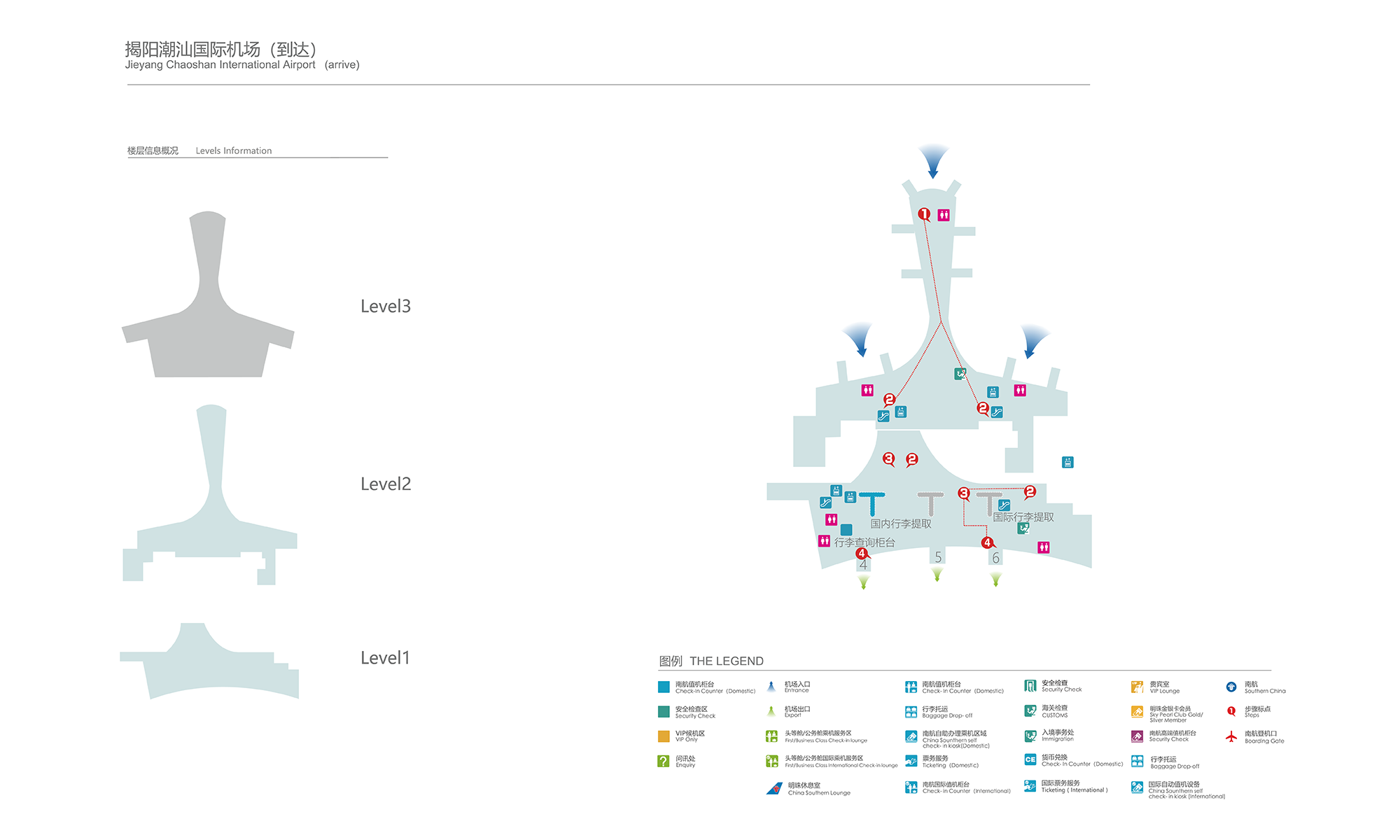 一层:国内、国际到达层。设有国内、国际旅客行李提取大厅,国际到达海关检查,政要贵宾厅及商务贵宾厅。