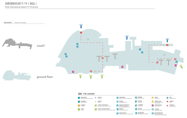 到国际候机楼, 沿着Great Eastern 高速路向东,从 Perth 市中心,右转到Tonkin 高速路和向东南, 在Horrie-Miller Drive左转. 到国内候机楼, Great Eastern 高速路向东,从 Perth 市中心出发在Brearley Avenue右转.