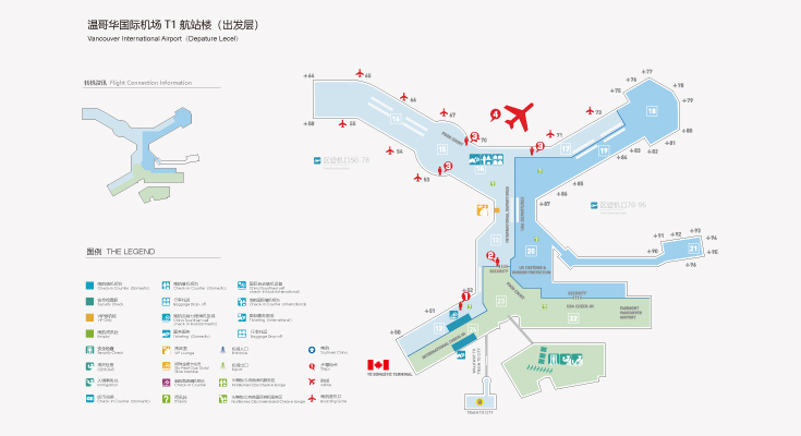 温哥华国际/国内机场大楼是相通的。所有航站楼转机均可走路到达,跟着指示牌走,路程大约10分钟。