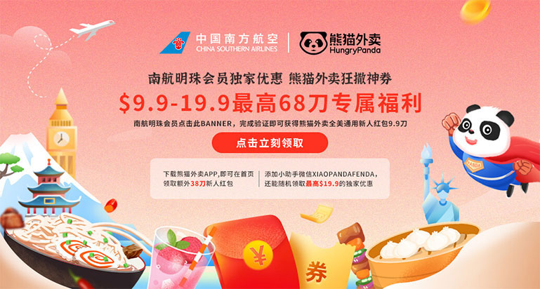 添加熊猫外卖小助手微信“xiaopandafenda”,发送“南航会员福利”领取最高$19.9